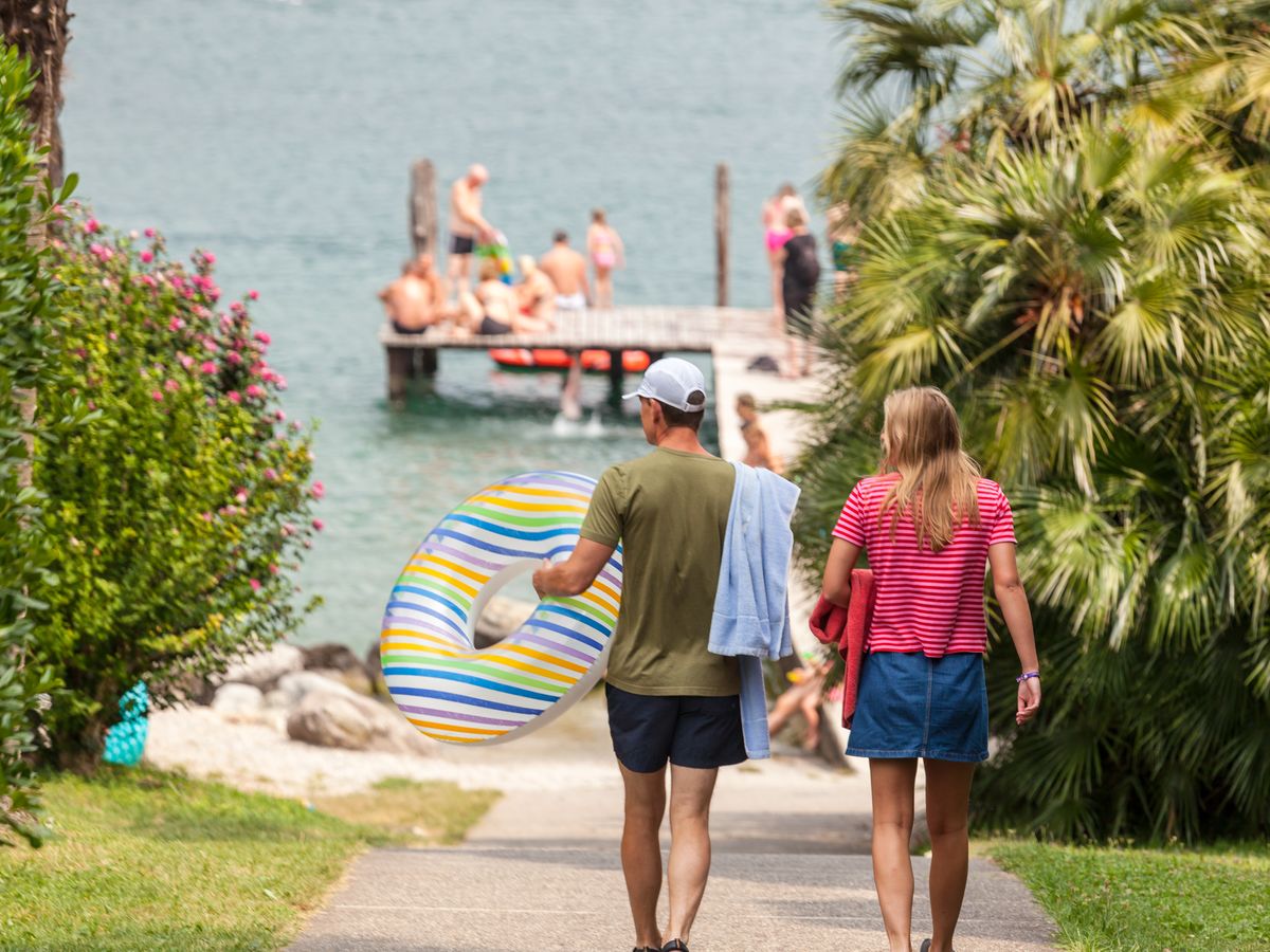 Die meisten unserer Unterkünfte befinden sich im oberen Teil des Campingplatzes, in der Nähe des zweiten Pools mit zwei Rutschen: einer 60 Meter langen und der großen gelben Huggy Buggy-Rutsche. Um hierher zu gelangen, nimmt man entweder die Treppe oder geht den (steilen) Hauptweg entlang. Am Ende des Campingplatzes, nur wenige Gehminuten entfernt, liegt der Gardasee mit einem privaten Kieselstrand, einem Steg und einer kleinen Wiese. Für einen Urlaub am Gardasee ist Eden der ideale Campingplatz!