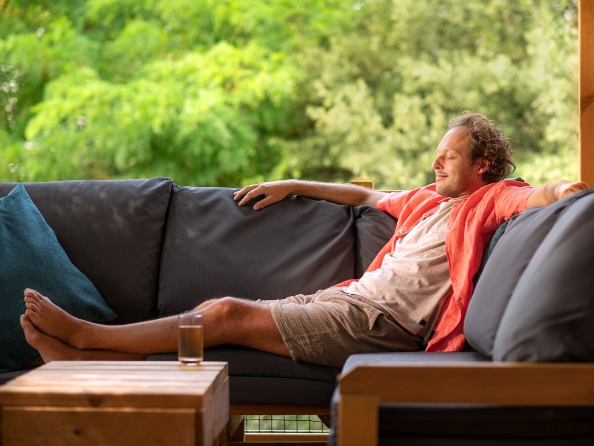 Auf der insgesamt 19 m² großen Holzterrasse mit Essbereich und großer Ecklounge befinden sich 4 verstellbare Stühle mit Sitzkissen und eine verstellbare Liege. Das Loungesofa über Eck ist mit bequemen Sitzkissen ausgestattet. Die Terrasse ist komplett überdacht und immer mit einem verschließbaren Tor ausgestattet. Ein Sonnensegel sorgt für extra Privatsphäre und Schatten. Auf der Seite des Campingplatzes können Sie nachlesen, welche kostenlose Grillplatte Ihre Unterkunft hat.