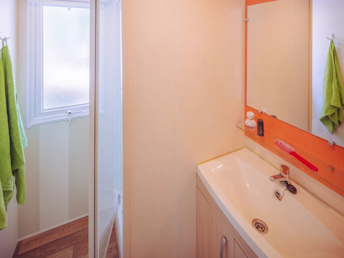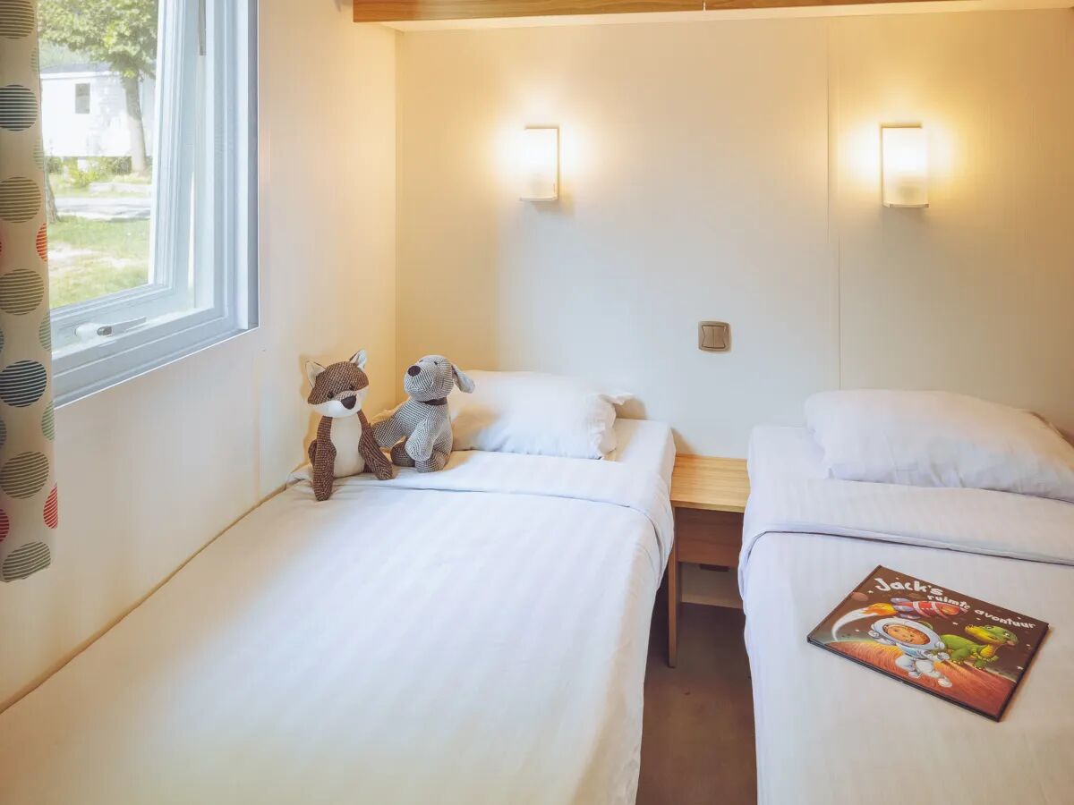 Dieses geräumige Mobilheim verfügt über 3 Schlafzimmer. Im Elternschlafzimmer steht ein Doppelbett mit den Maßen 2,00 x 1,60 m: extra groß! Das zweite Schlafabteil ist mit 2 Einzelbetten (2,00 x 0,70 m) ausgestattet und das dritte Schlafabteil verfügt über ein Doppelstockbett (1,90 m lang, bix max. 70 kg.). In jedem Mobilheim finden Sie außerdem ein Bettgitter (entweder ein festes Metallgitter oder als loses Gitter), sodass Ihre Kleinen nicht aus dem Bett fallen. Alle Betten sind mit Kissen und 1-Personen-Decken ausgestattet. Die Fenster der Schlafabteile sind mit Fliegengittern versehen. Im Badezimmer gibt es eine Duschkabine und ein Waschbecken. Für mehr Komfort verfügt das Mobilheim Comfort Plus Lounge über eine separate Toilette.