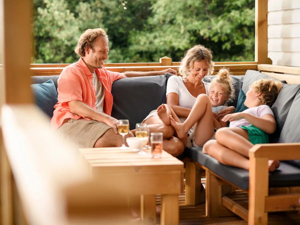 Die Holzveranda ist überdacht und nicht weniger als 24 m2. Das luxuriöse Gartenset besteht aus vier verstellbaren Stühlen mit Kissen und zwei Schalensitzen. Auf der anderen Seite der Veranda ist eine schöne Lounge-Sofa mit großen bequemen Kissen. Mit dem Roan-Sonnenbanner können Sie jederzeit Schatten unter dem Vordach schaffen. Auf der Seite des Campingplatzes können Sie nachlesen, welche kostenlose Grillplatte Ihre Unterkunft hat.
