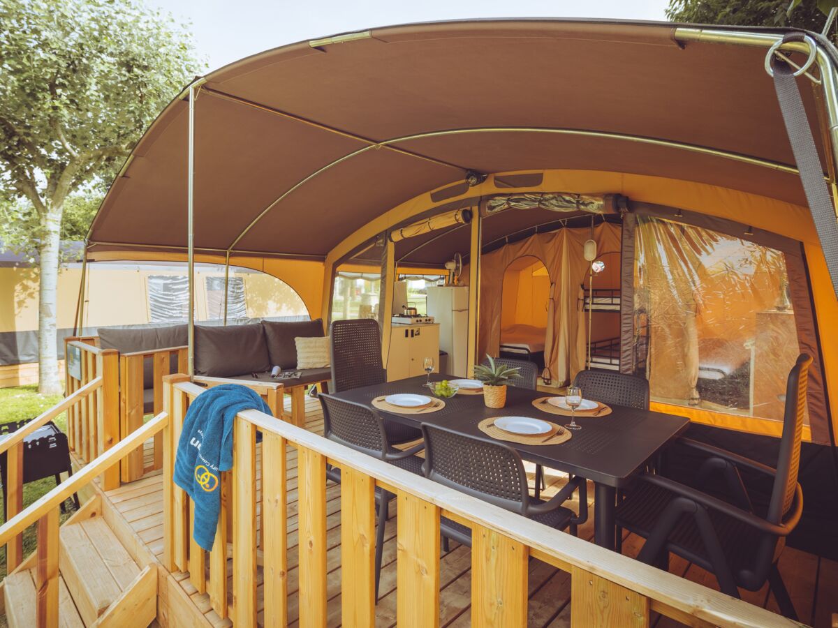 Die Holzterrasse ist immer abschließbar und mit einem Loungesofa samt Sitzkissen, einem Esstisch, 2 verstellbaren Liegestühlen und 4 Gartenstühlen ausgestattet. Die Seite des Vordachs, wo der Esstisch steht, ist für etwas mehr Privatsphäre blickdicht. Ihr Lodgezelt ist mit einem kostenlosen Holzkohlegrill, Gasgrill oder Elektrogrill ausgestattet. Auf der Seite des Campingplatzes können Sie nachlesen, welche kostenlose Grillplatte Ihre Unterkunft hat.