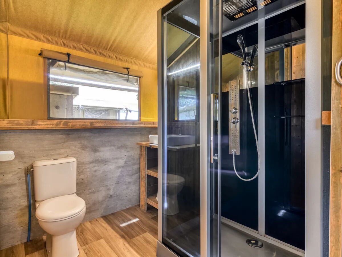 Die robuste Holzküche verfügt über verschließbare Küchenschränke mit praktischer Arbeitsplatte, Spülbecken und 4-flammigem Gasherd. Komplettiert wird das Ganze durch einen hohen Kühlschrank mit separatem Gefrierfach. Für die kühleren Tage befindet sich eine kleine elektrische Heizung im Zelt. Im Wohnzimmer steht ein Esstisch mit 6 Stühlen. Dieser Typ Lodgezelt verfügt über ein komplett eingerichtetes Badezimmer mit praktischer Duschkabine, Toilette und Waschtisch.