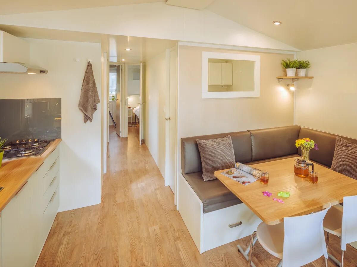 Das Mobilheim Premium hat eine kleine Küchenzeile und ein großzügiges Wohnzimmer. Aus der Sitzecke zaubern Sie im Handumdrehen ein komfortables 1-Personen-Bett. Die Decke verläuft schräg nach oben, damit sich auch größere Personen nicht so schnell den Kopf stoßen. Die Standardausstattung besteht aus Mikrowelle, Geschirrspüler, Kühlschrank mit separatem Tiefkühlfach, Nespresso Kaffeemaschine und Klimaanlage. Darüber verfügt das Mobilheim über Satellitenfernsehen mit deutschsprachigen Sendern. Im geräumigen Badezimmer gibt es eine Duschkabine sowie ein Waschbecken mit kleinem Schrank. Die Toilette ist separat.