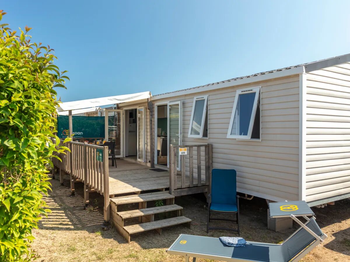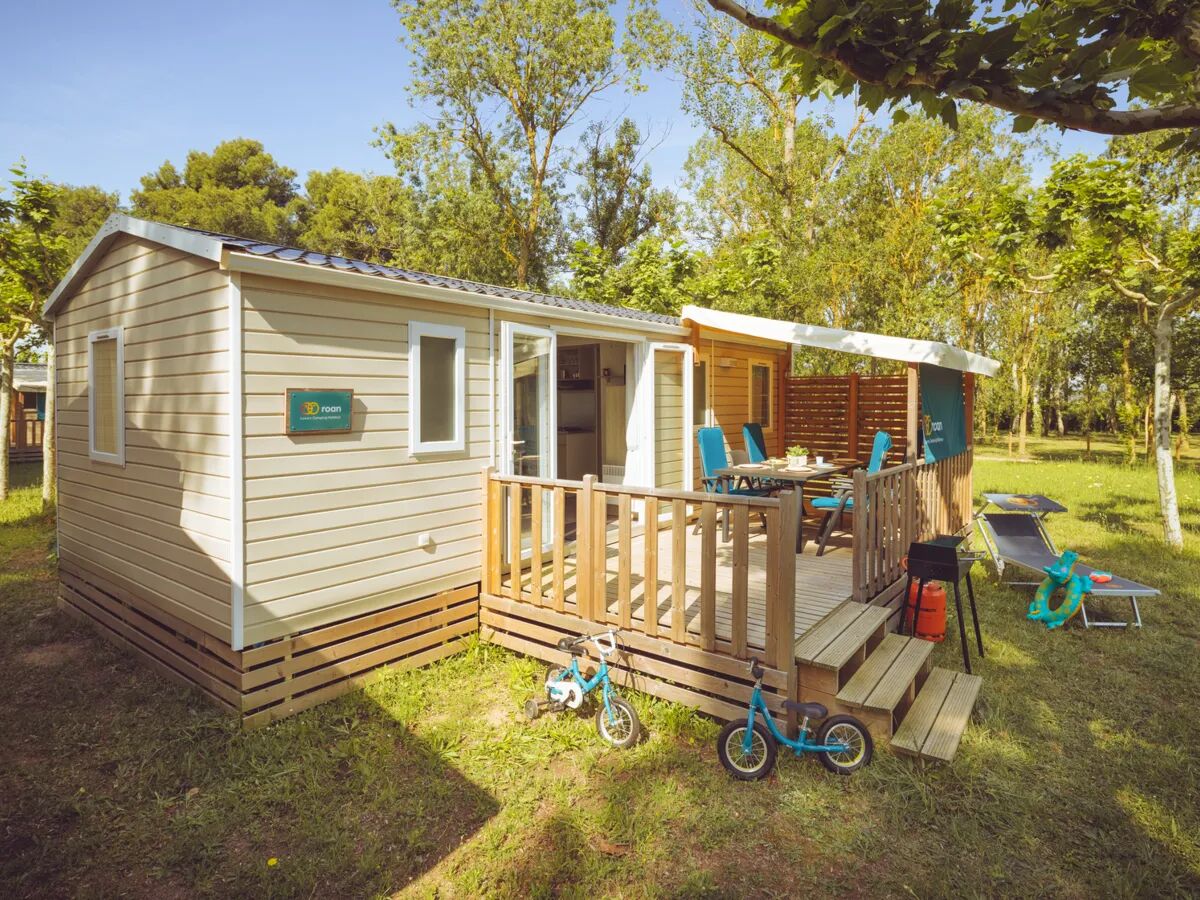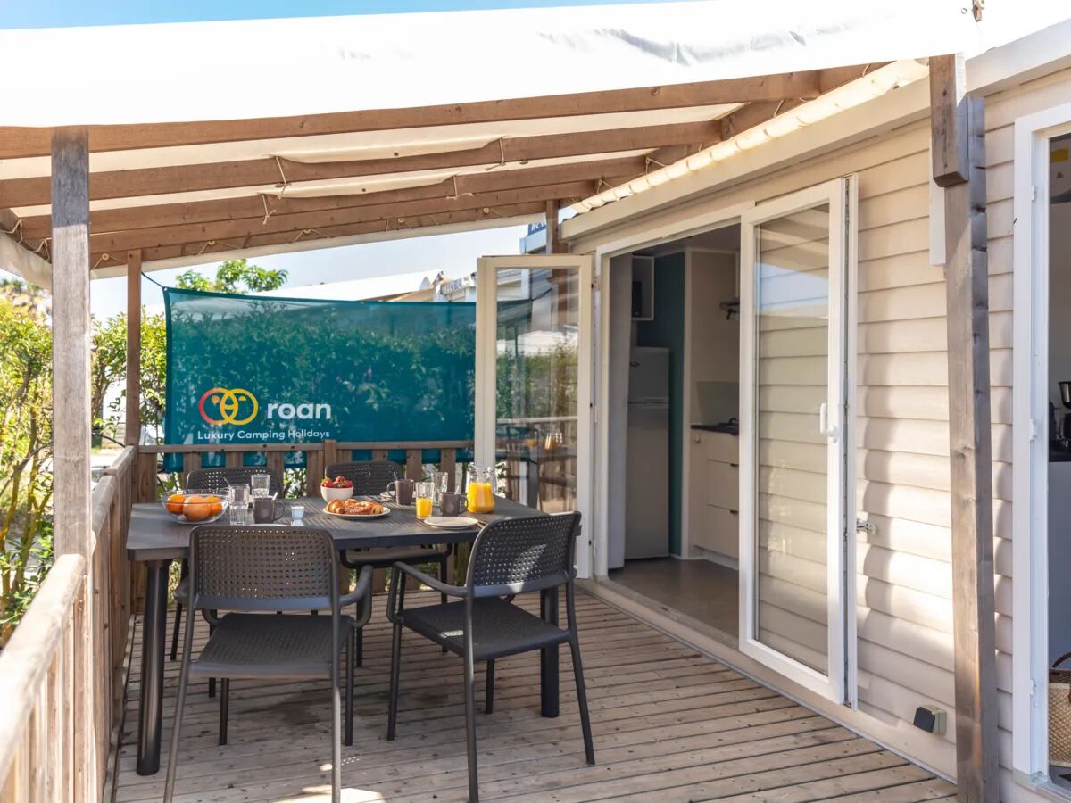 Dieses luxuriöse Mobilheim Premium ist mit einer (halb) überdachten Holzterrasse mit modernen Gartenmöbeln und einem eigenen Grill ausgestattet.