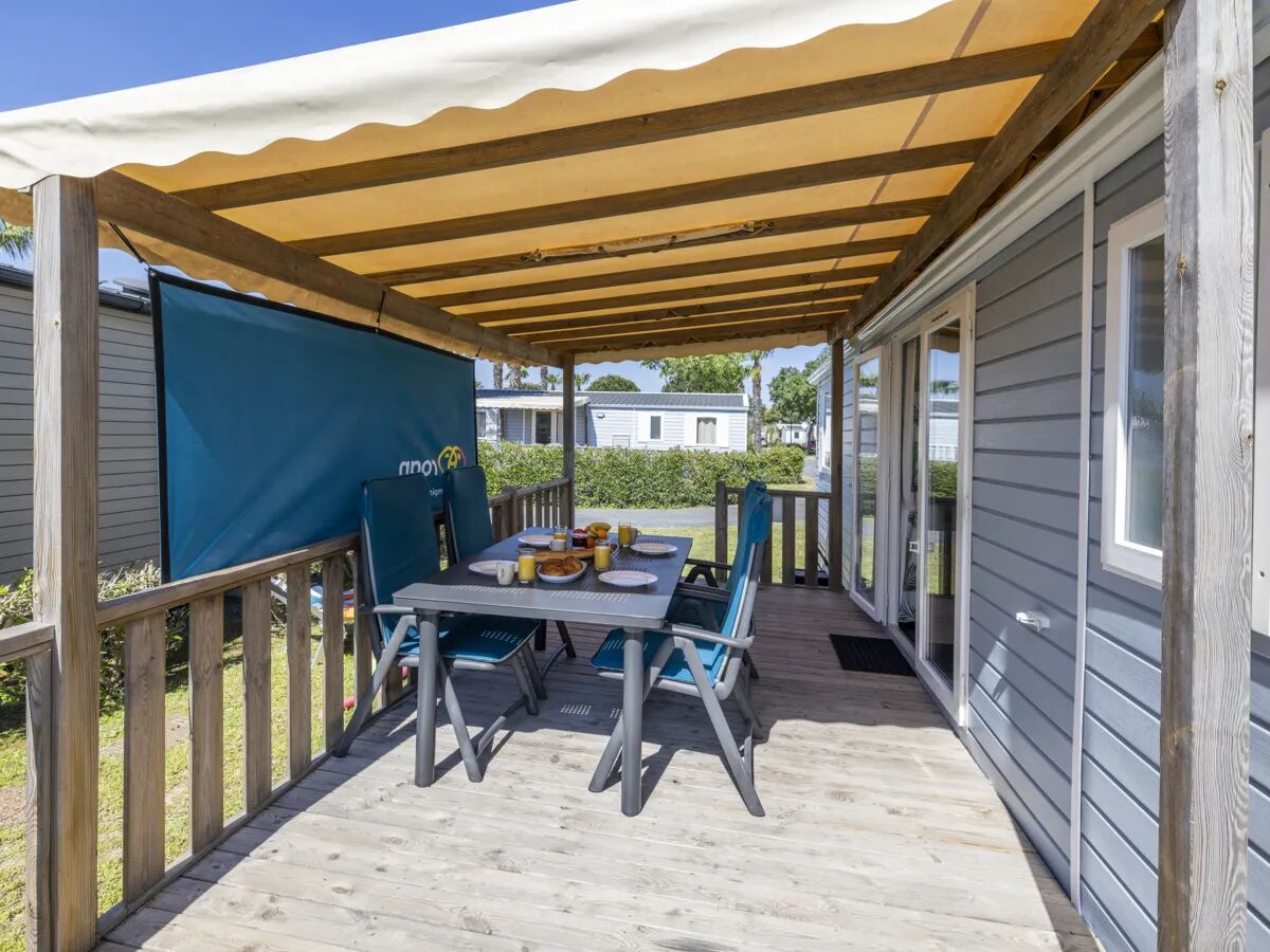 Klimaanlage HolzterrasseDieses mit 40 m² sehr geräumige und voll ausgestattete Mobilheim hat eine kostenlose Klimaanlage und eine halb überdachte Holzterrasse.