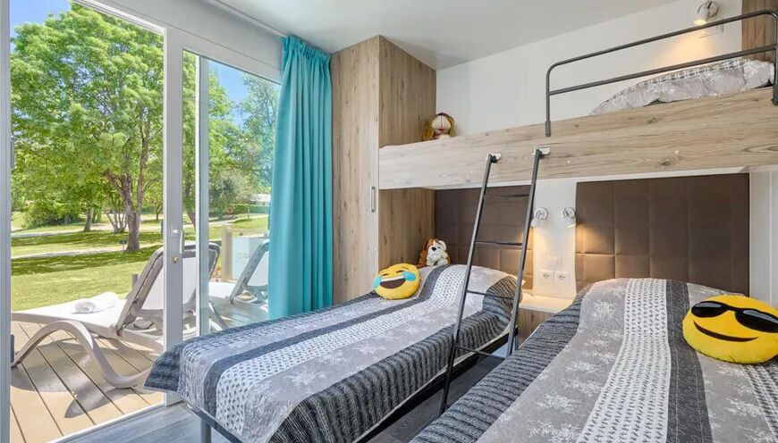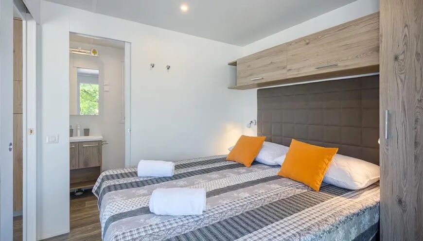 Dieses luxuriöse Mobilheim hat 2 Schlafzimmer. Das Hauptschlafzimmer verfügt über ein Doppelbett (2,00 x 1,60 m). Das 2. Schlafzimmer hat 2 Einzelbetten und ein Kinderhochbett quer über den Einzelbetten. Alle Schlafzimmerfenster verfügen über Fliegengitter und auch ein Bettgitter gehört zur Standardausstattung.