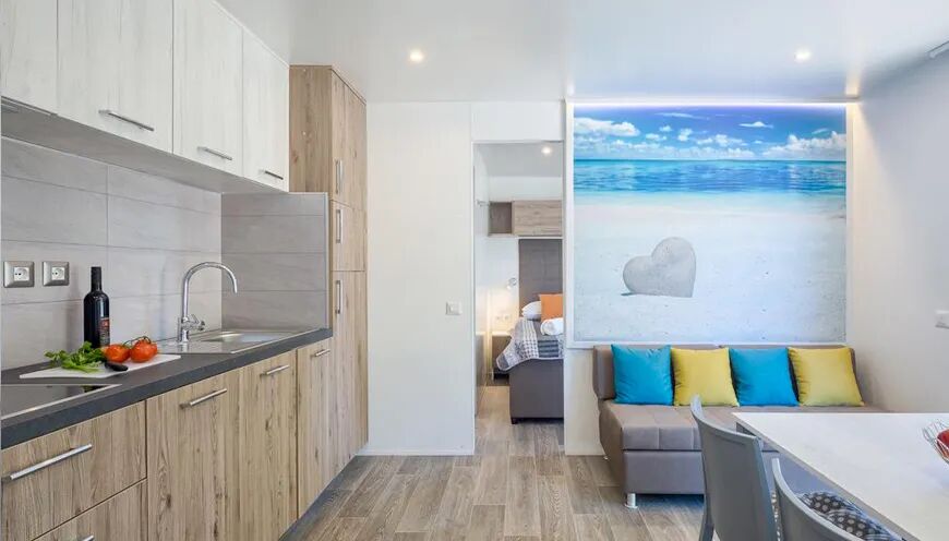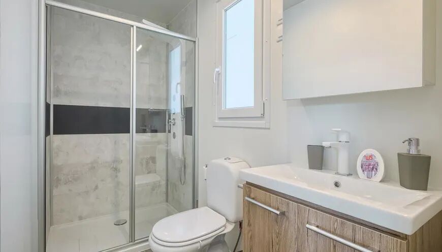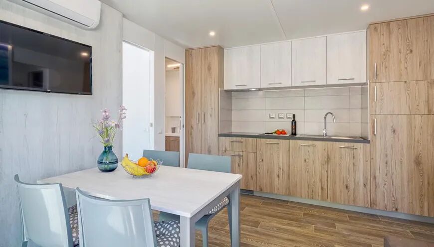 Die Küche verfügt über einen Kühlschrank mit separatem Gefrierfach, ein 4-Flammen-Gaskochfeld, eine Mikrowelle, eine Nespresso-Kaffeemaschine, einen Wasserkocher, eine Spülmaschine sowie umfangreiches Kücheninventar. Im Wohnzimmer gibt es einen Satellitenfernseher. Für zusätzlichen Komfort verfügt dieses Mobilheim über zwei Bäder. Das Badezimmer neben dem Schlafzimmer mit Doppelbett verfügt über eine große Duschkabine, ein Waschbecken und eine Toilette. Das zweite Badezimmer hat ebenfalls eine Toilette, ein Waschbecken und eine geräumige Duschkabine.